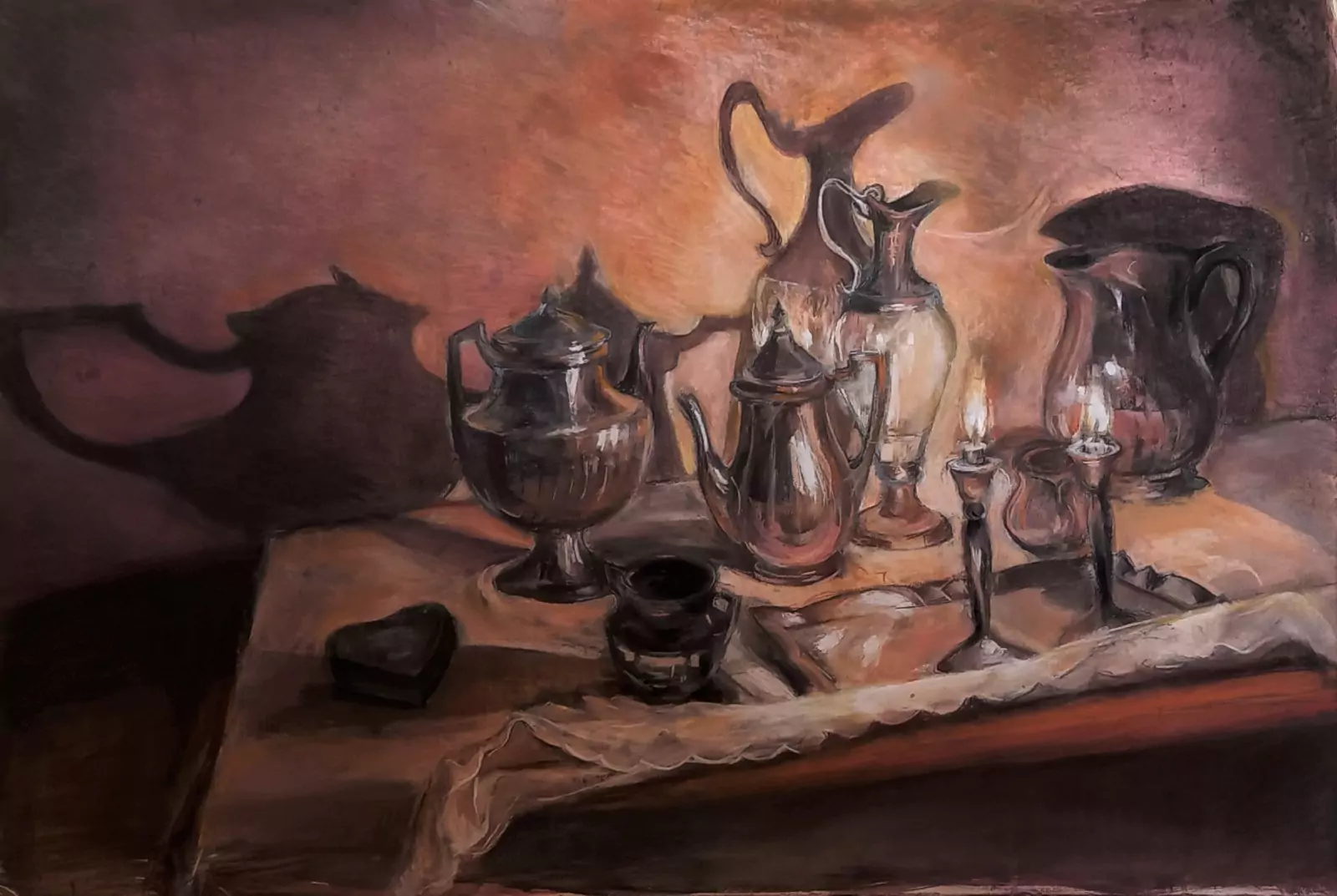ציור ראליסטי על פי טבע דומם…עם השתקפות של אור הנרות על כלי כסף וזכוכית ,והצל שלהם על הקיר.