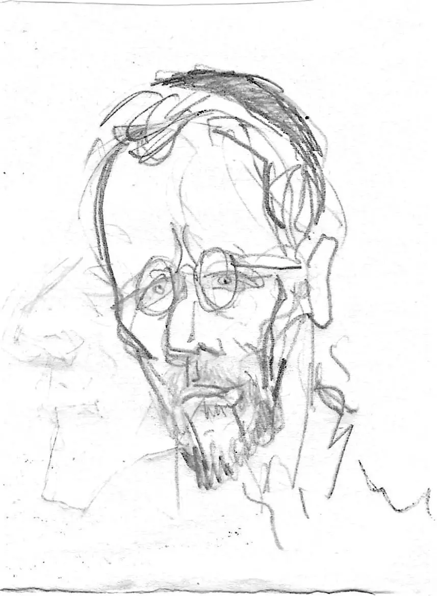 רישום עיפרון של פנים אנושיות בסגנון מופשט ולא גמור. הדמות נראית מבוגרת, עם זקן, משקפיים וקו שיער נסוג. הקווים חופשיים ומביעים אופי ורגש תוך שימוש מינימלי בפרטים.