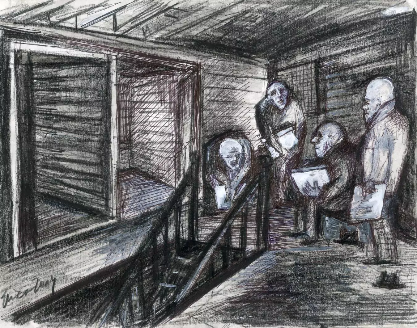קבוצה של אנשים זקנים יושבים על ספסל אם תיקיות משמחים בידיהם מול משרדים ריקים -אולי מישהו בכל זאת יבוא…