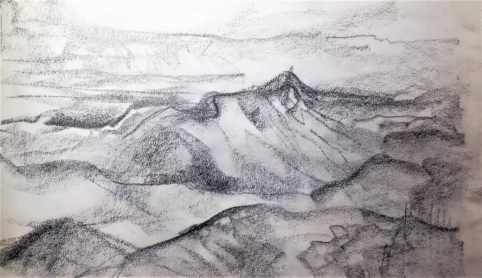 סקיצה בעיפרון של נוף הררי עם פסגה מרכזית ובתוכה קווי רכסים ועמקים. הצללות מדויקות וקווים רכים יוצרים תחושת עומק וטופוגרפיה מחוספסת, תוך שמירה על אווירה טבעית ומרוחקת.