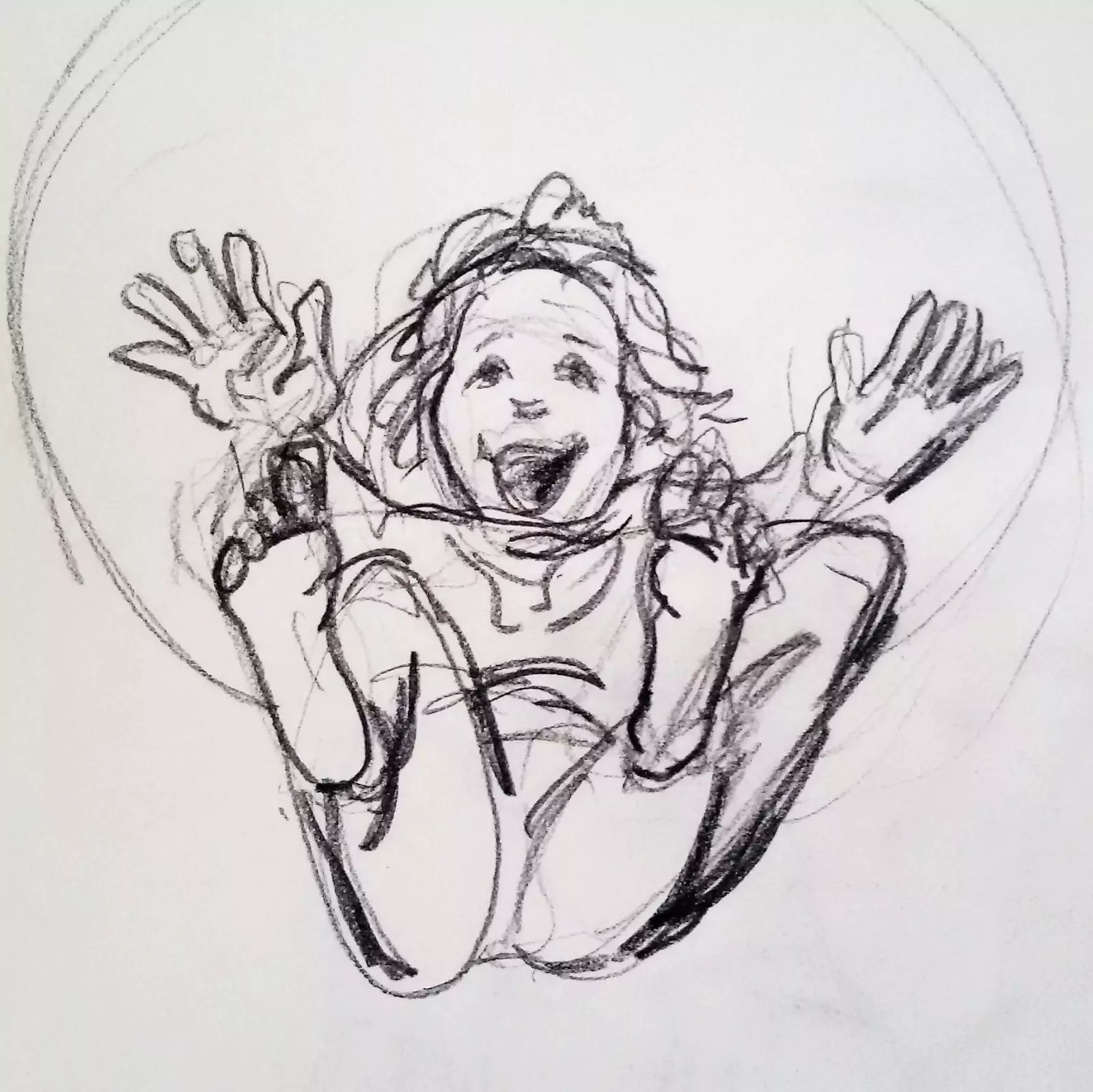 רישום בעיפרון של ילד בתנועה אווירית, עם ידיים מורמות והבעה מלאת התלהבות. הקווים החופשיים והדינמיים מדגישים את תחושת התזוזה והחיוניות, ויוצרים רגע של ילדות שובבה בתנועה.